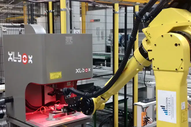 SIC MARKING a proposé au client l’installation d’une station XL Box avec porte automatique. Cette porte permet l’intégration dans l’îlot robotisé car c’est le robot qui positionne la pièce et la ressort de la machine. L’étude et la réalisation de posage se sont adaptées aux pièces. Le client a privilégié la mise en place d’une option de lecture intégrée dans la tête de marquage en sortie de station laser. Elle est la garantie d’une pièce correctement marquée avec un Datamatrix respectant les normes de qualité.